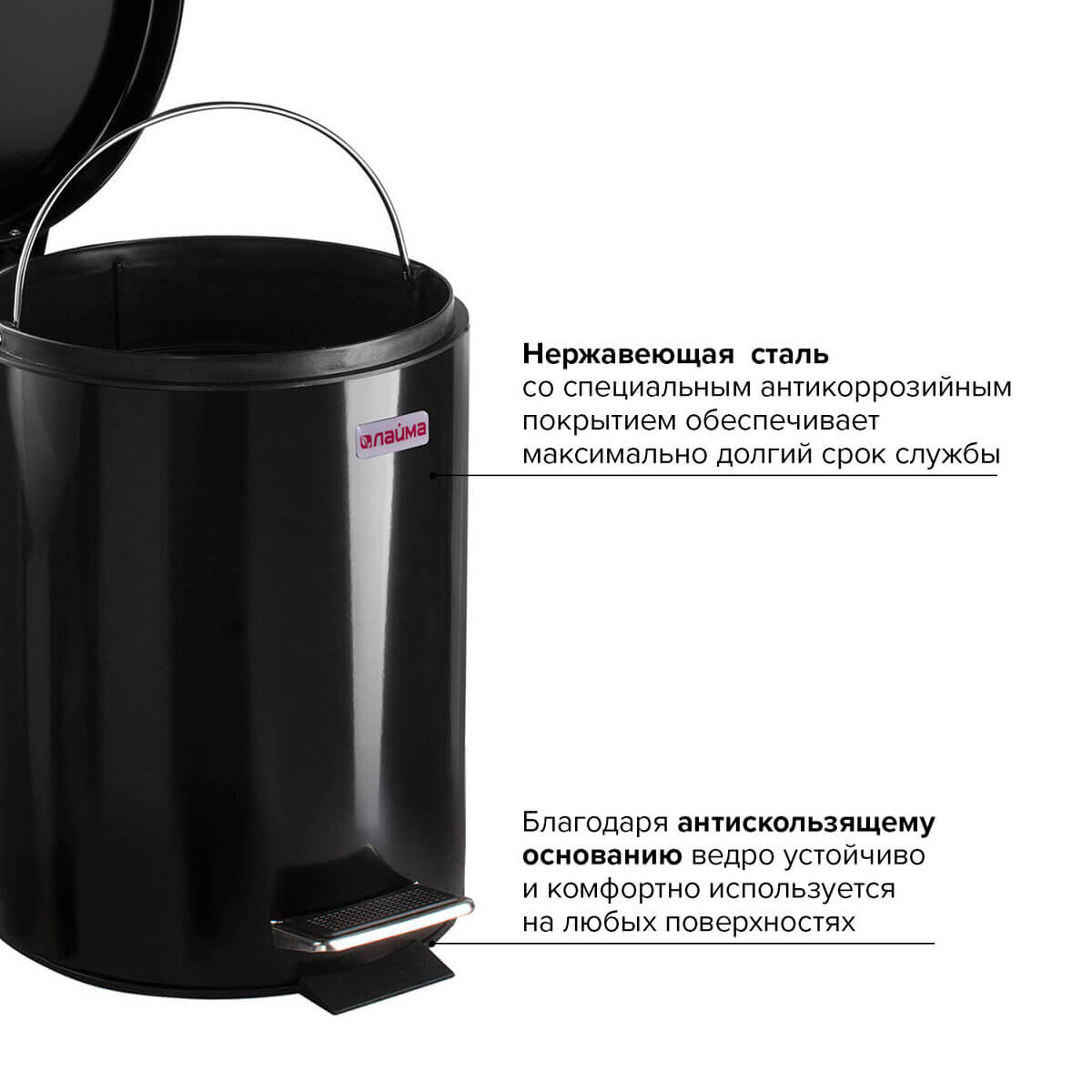 Съемное внутреннее ведро с рукояткой для извлечения облегчает процесс утилизации. Оно изготовлено из нержавеющей стали с антикоррозийным покрытием, обеспечивая долгий срок службы. Антискользящее основание делает это ведро стабильным и надежным.