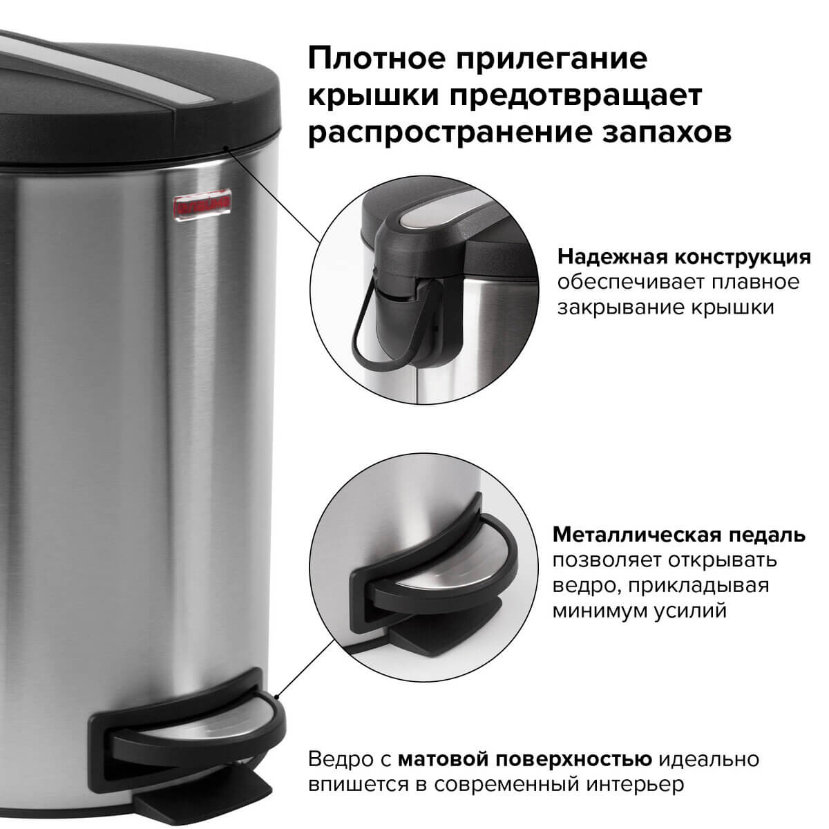 С вместимостью 12 литров, это ведро идеально подходит для помещений с средней проходимостью. Педаль облегчает открывание крышки, а плотное прилегание её к корпусу надежно удерживает запахи. Внутренний пластиковый контейнер снабжен удобной ручкой для легкого извлечения.